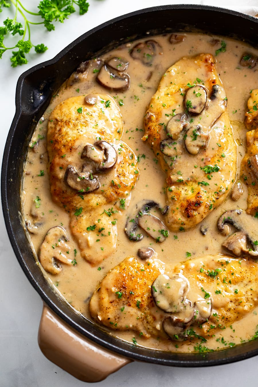 In a large skillet, melt butter in olive oil over medium heat. Place chicken in the pan, and lightly brown.